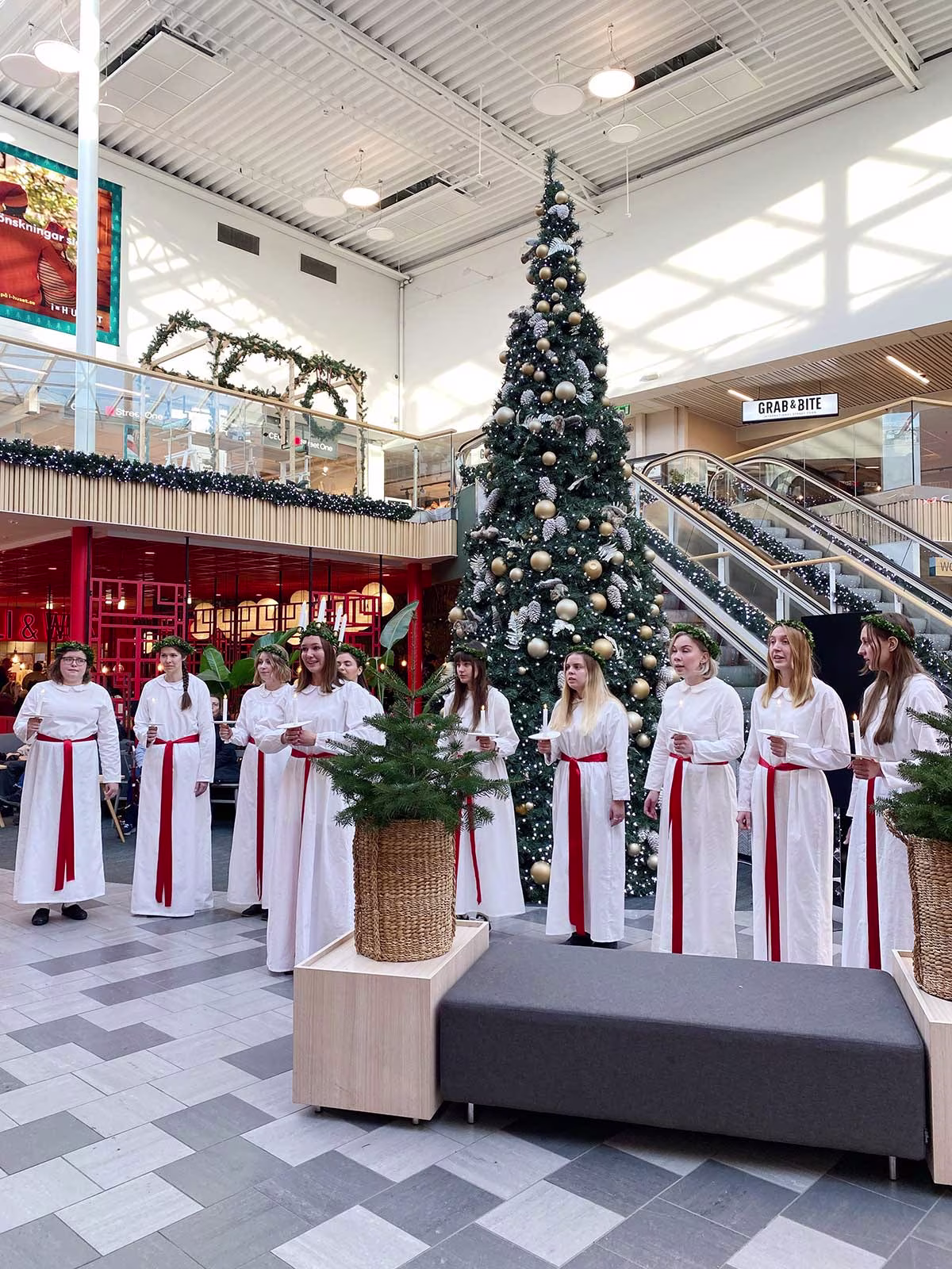 Luciatåget rör sig runt på i-HUSET och stannar upp på Matloftet, vid södra entrén samt vid IKEAs entré.